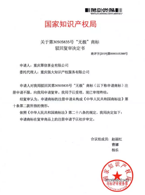 近日,我司收到國家知識產(chǎn)權(quán)局發(fā)來的關(guān)于第30505835號“無極”商標(biāo)駁回復(fù)審決定書,對該商標(biāo)的注冊申請予以初步審定。至此,我司代理的重慶翠信茶業(yè)有限公司第30505835號“無極”商標(biāo)駁回復(fù)審成功!